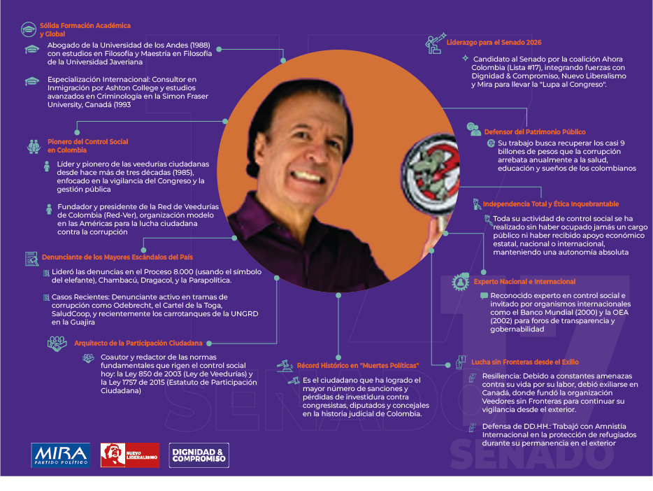 Es el fundador de la Red de Veedurías de Colombia y líder de la lucha anticorrupción por más de tres décadas. Como coautor de la Ley de Veedurías y experto en criminología, ha mantenido una trayectoria independiente sin haber ocupado nunca cargos públicos.